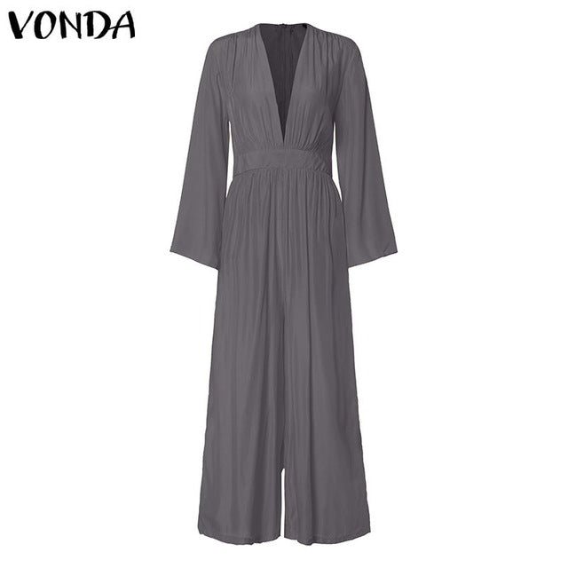 VONDA Elegant Women V neck Jumpsuits Summer Long Sleeve Solid Rompers Casual Work OL Overalls Femme Wide Leg Pants Plus Size 5XL